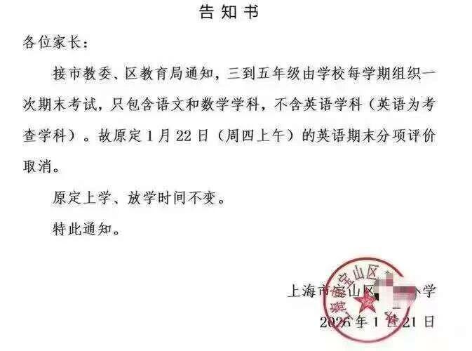这两天,一张上海小学的“告知书”在家长群里刷屏。三到五年级期末只考语文、数学,原定的英语期末评价取消。消息一出,如一颗深水炸弹般把家长们震晕了。大家的反应明显分化。有人觉得终于可以不用复习英语了。但也有人很焦虑:如果学校都不考英语了,孩子还要不要学?还有没有动力学?长期以来,上海是中国英语教育水平最高的城市之一,上海小学生英语基础普遍较好,家长对英语投入也...