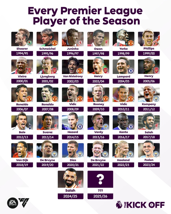 历届英超赛季最佳球员: